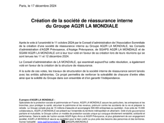 Après le vote à l’unanimité le 11 octobre 2024 par le Conseil d’administration de l’Association Sommitale de la création d’une société de réassurance interne au Groupe AG2R LA MONDIALE, les Conseils d’administration d’AG2R Prévoyance, d’Arpège Prévoyance, de SGAPS AG2R LA MONDIALE et de SGAM AG2R LA MONDIALE ont à leur tour voté en faveur de sa création lors de leurs réunions qui se sont tenues les 11 et 12 décembre 2024.