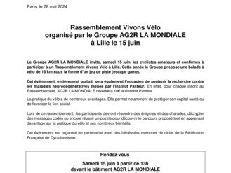 Le Groupe AG2R LA MONDIALE invite, samedi 15 juin, les cyclistes amateurs et confirmés à participer à un Rassemblement Vivons Vélo à Lille. Cette année le Groupe propose une balade à vélo de 16 km sous la forme d’un jeu de piste (escape game).