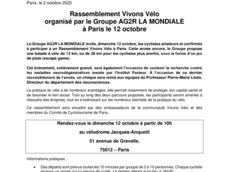 Le programme Vivons Vélo a pour objectif d’inciter le plus grand nombre à pratiquer le cyclisme, sport accessible à tout âge et particulièrement approprié pour prendre soin de son capital santé. C’est pourquoi le Groupe organise chaque année, aux côtés de la Fédération Française de Vélo, de nombreux rassemblements partout en France. Pour chaque participant inscrit, AG2R LA MONDIALE fait un don au profit de l’Institut Pasteur afin de soutenir les recherches menées par le professeur Pierre-Marie Lledo contre les maladies neurodégénératives (Alzheimer, Parkinson, ...). Ainsi depuis le lancement de Vivons Vélo en 2015, ces événements ont réuni plusieurs milliers de participants. Cette année, plus de 520 cyclistes amateurs sont venus pédaler pour la bonne cause lors des 5 premiers rassemblements de 2025 à Toulouse, Grenoble, Bordeaux, Lille et Strasbourg.